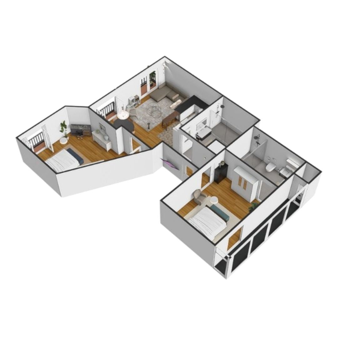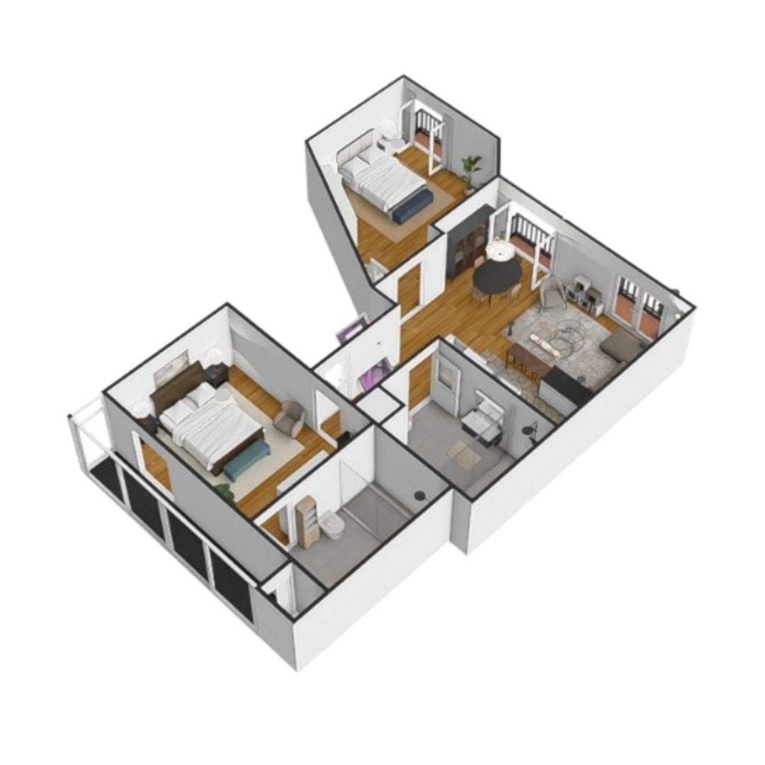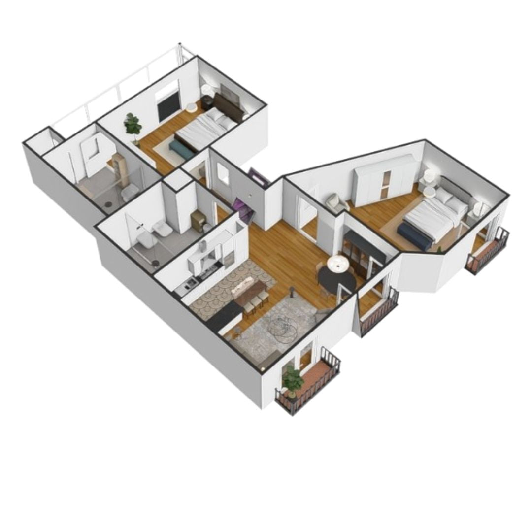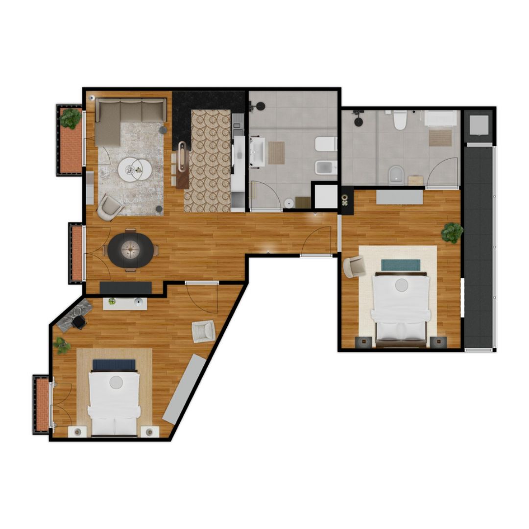 Dos habitaciones dobles, una en suite, junto a una cocina abierta totalmente equipada y baños modernos que reflejan calidad y confort.
